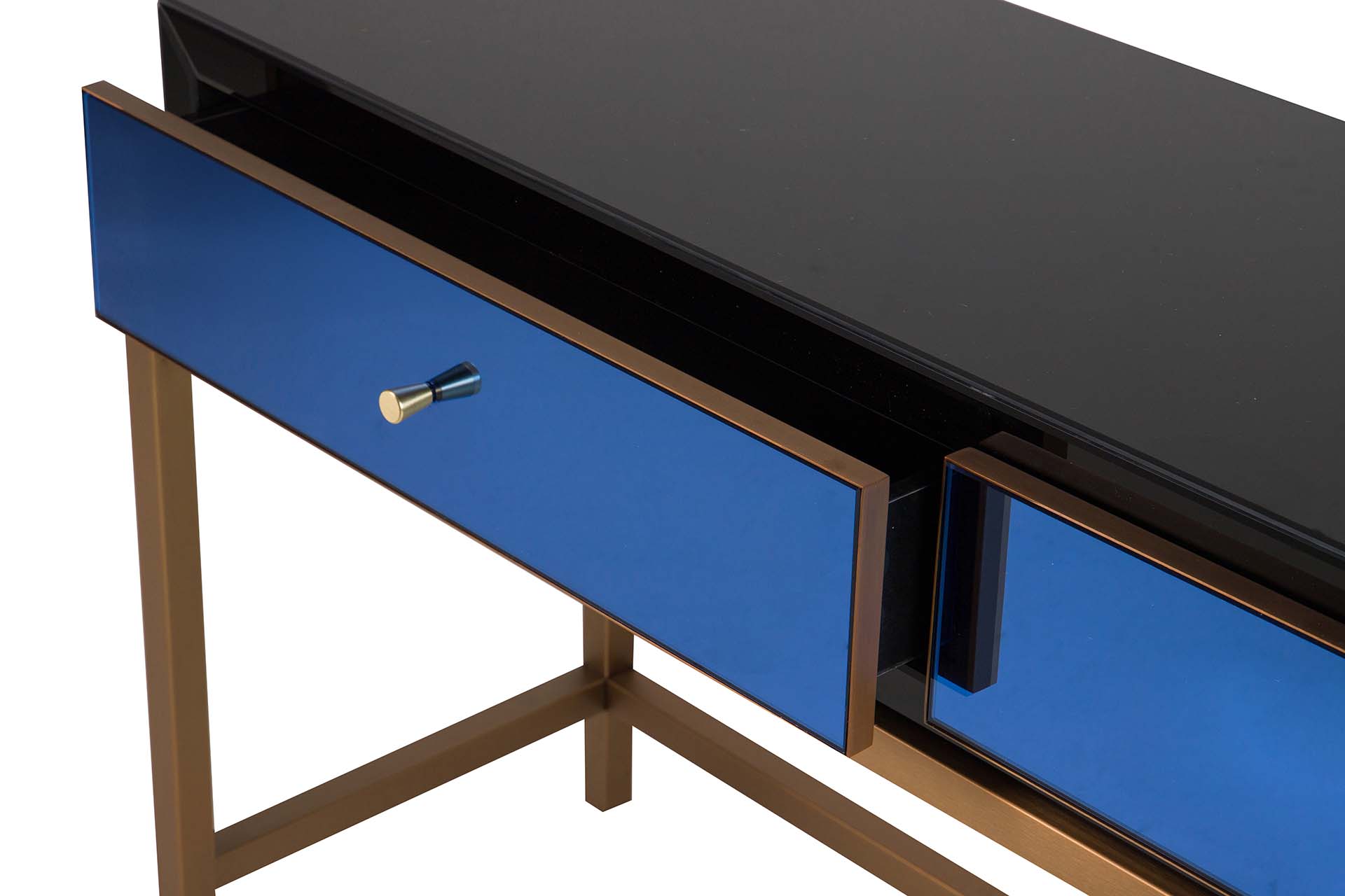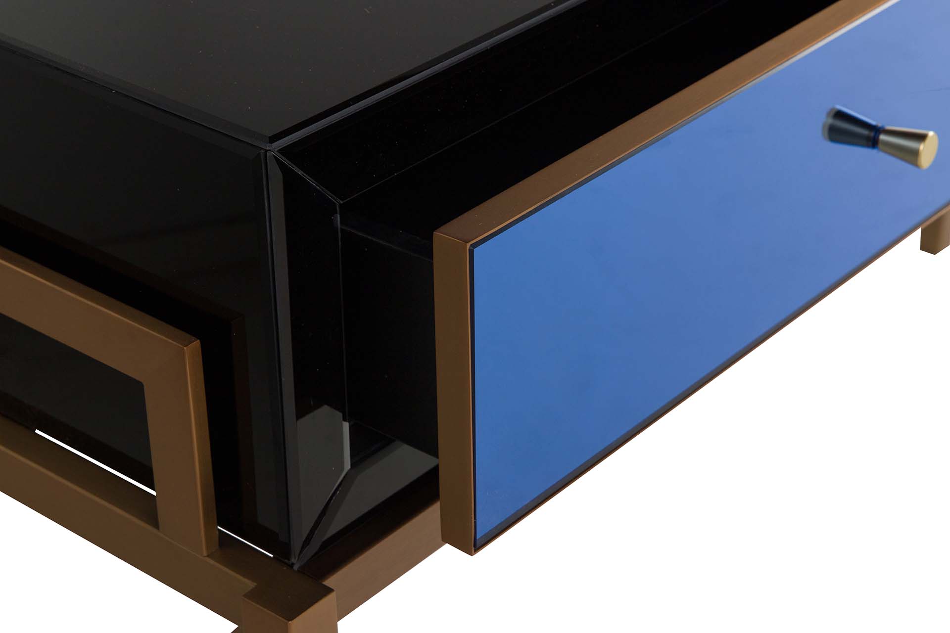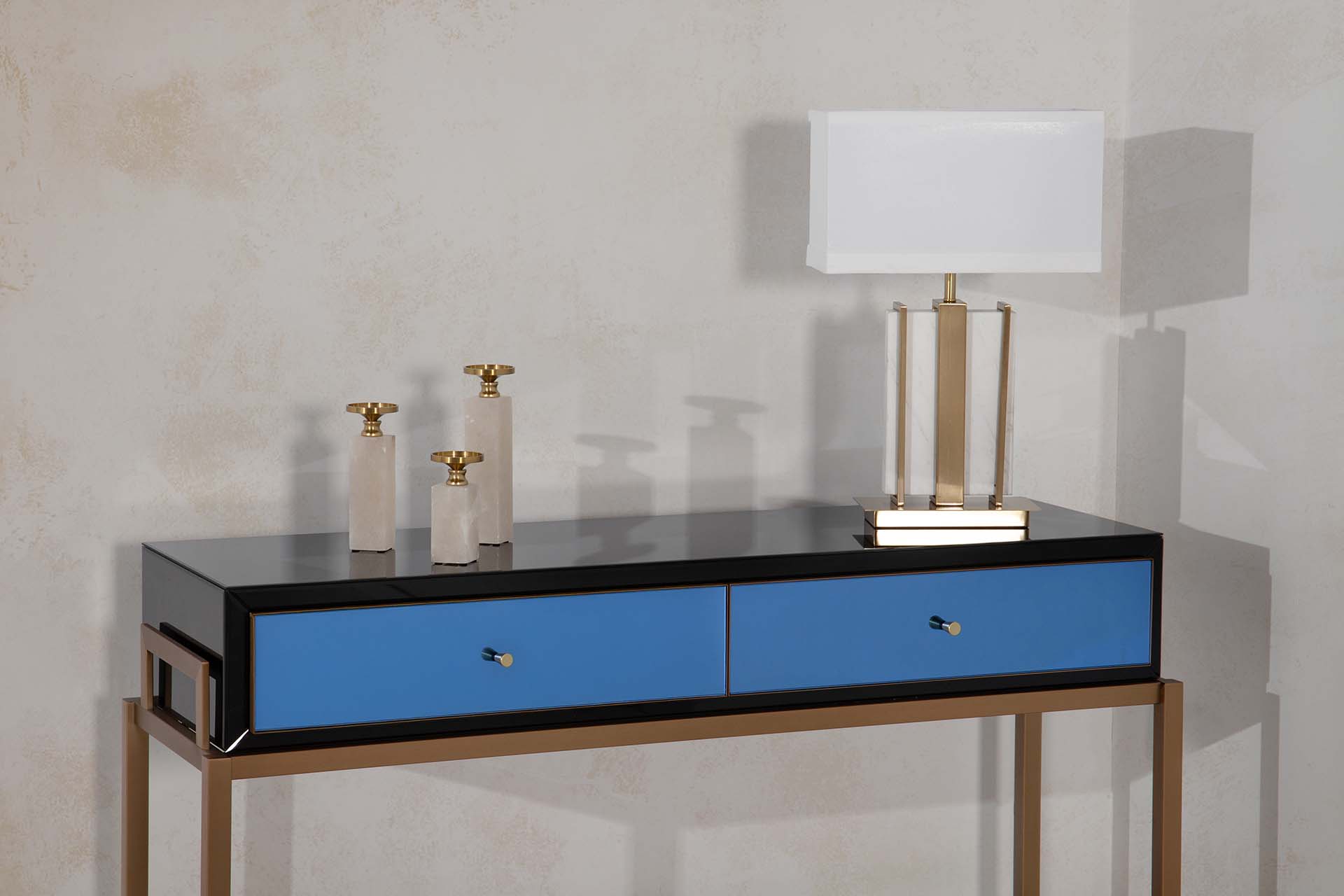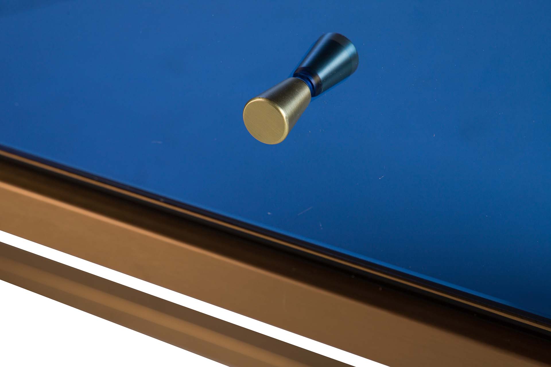 Su acabado en tonos dorados o azules añade un toque distintivo y personalizable a tu espacio. La superficie lisa refleja la luz natural e artificial, creando destellos que realzan su carácter único. Además, su estructura sólida te ofrece un amplio espacio para exhibir objetos decorativos o recuerdos especiales, haciendo que cada rincón cuente una historia llena de prestigio.