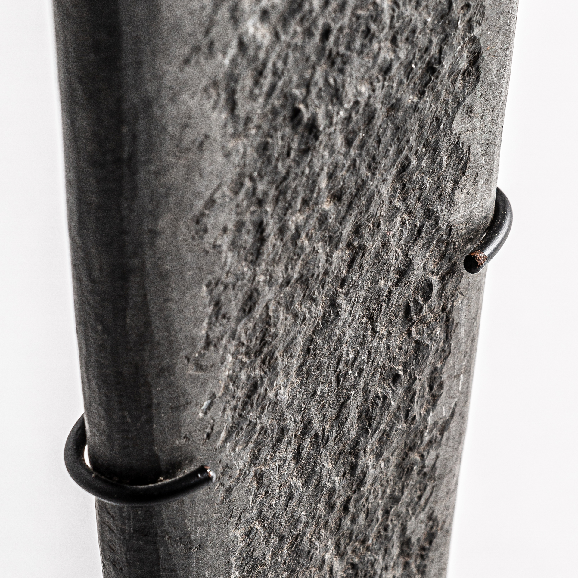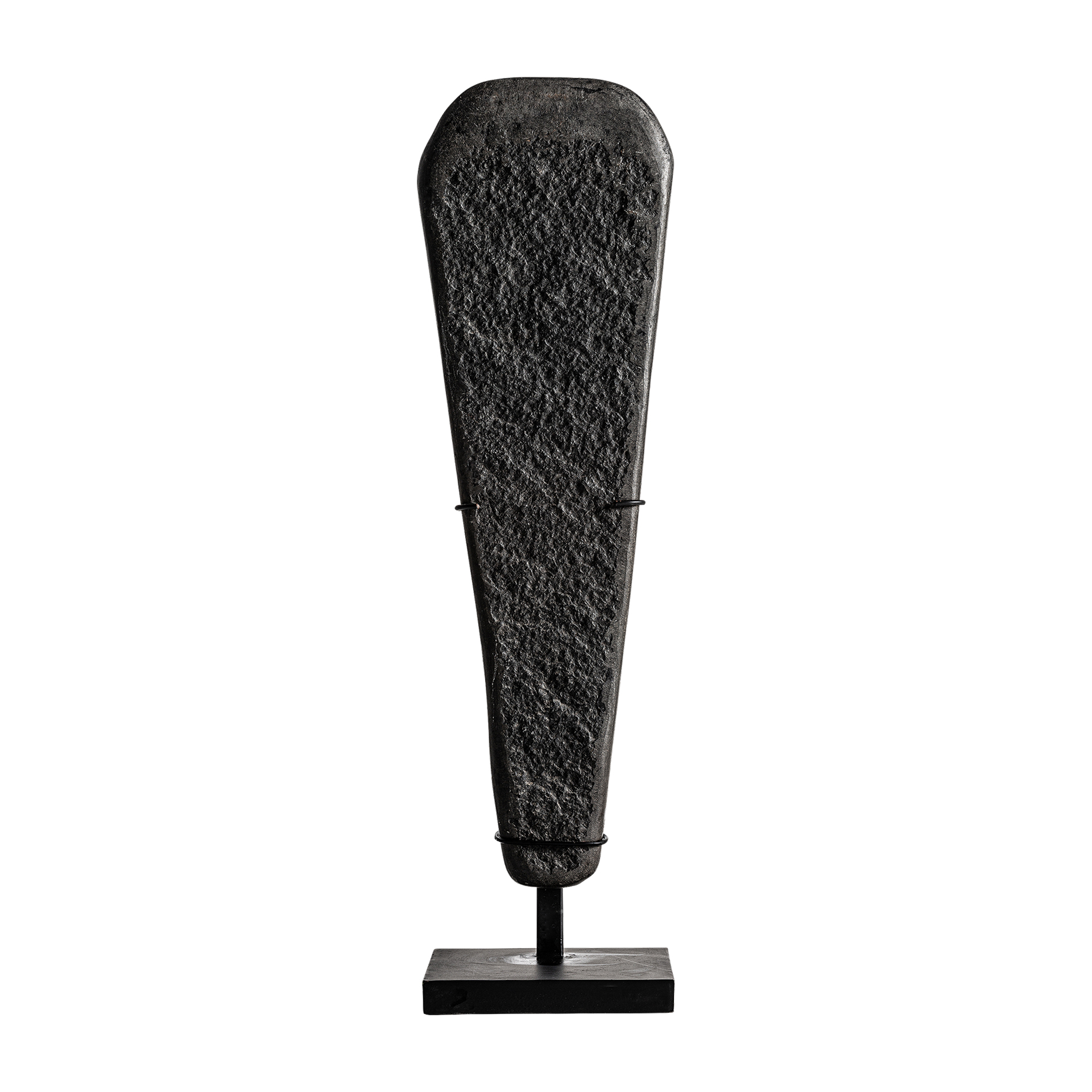 La escultura Stone, en piedra negra y hierro, destaca por su acabado artesanal y formas rotundas. VICAL firma esta pieza con su sello inconfundible.