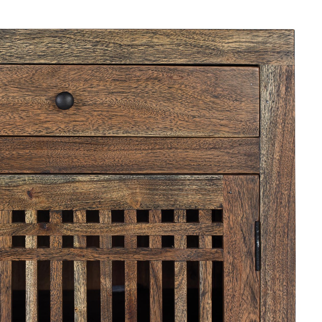 Su acabado cuidadosamente tratado resalta las vetas naturales de la madera, invitando a tocar su superficie suave y cálida. Los detalles metálicos en tonos oscuros o envejecidos aportan un contraste elegante que realza aún más su carácter distintivo. Además, sus tres puertas con estantes internos ofrecen una organización práctica sin sacrificar la estética, permitiendo mantener orden en ambientes sofisticados pero funcionales.
