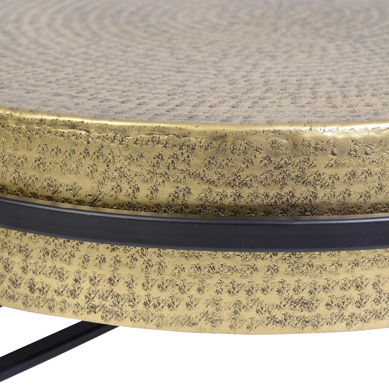Puedes imaginarte tocando la superficie repujada, sintiendo cómo sus relieves transmiten una sensación cálida y artesanal bajo tus dedos. La mezcla del acabado dorado en el centro con los detalles en negro crea un contraste visual impactante que resalta cada línea artística. La forma circular invita a la convivencia, favorece conversaciones íntimas o reuniones elegantes con amigos en torno a ella. En tu espacio, esta mesa se convierte en una obra escultórica que invita al tacto y despierta emociones profundas por su belleza única.
