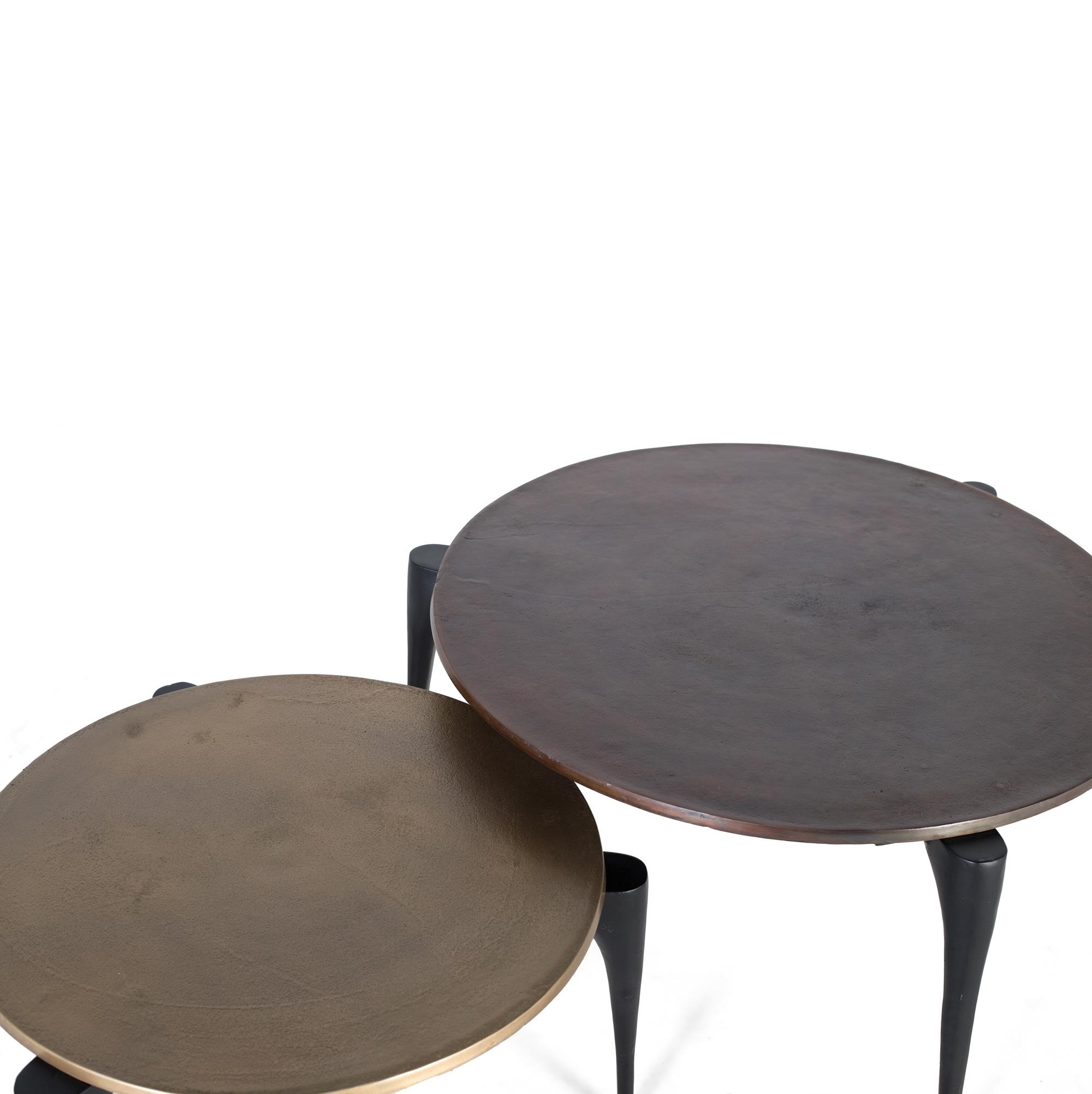 Poner en tu salón o dormitorio el Set de mesas Space significa crear un ambiente donde el lujo se siente en cada rincón. La textura sedosa del acabado dorado se contrapone con el negro mate, generando un contraste visual irresistible que captura la luz y juega con ella en diferentes momentos del día. Imagínalas junto a un sofá elegante, sirviendo como bases para lámparas artesanales o bandejas decorativas con objetos exclusivos; su presencia aporta una sensación de sofisticación discreta pero poderosa. La forma circular invita a la interacción, fomentando momentos íntimos y elegantes en torno a ellas.