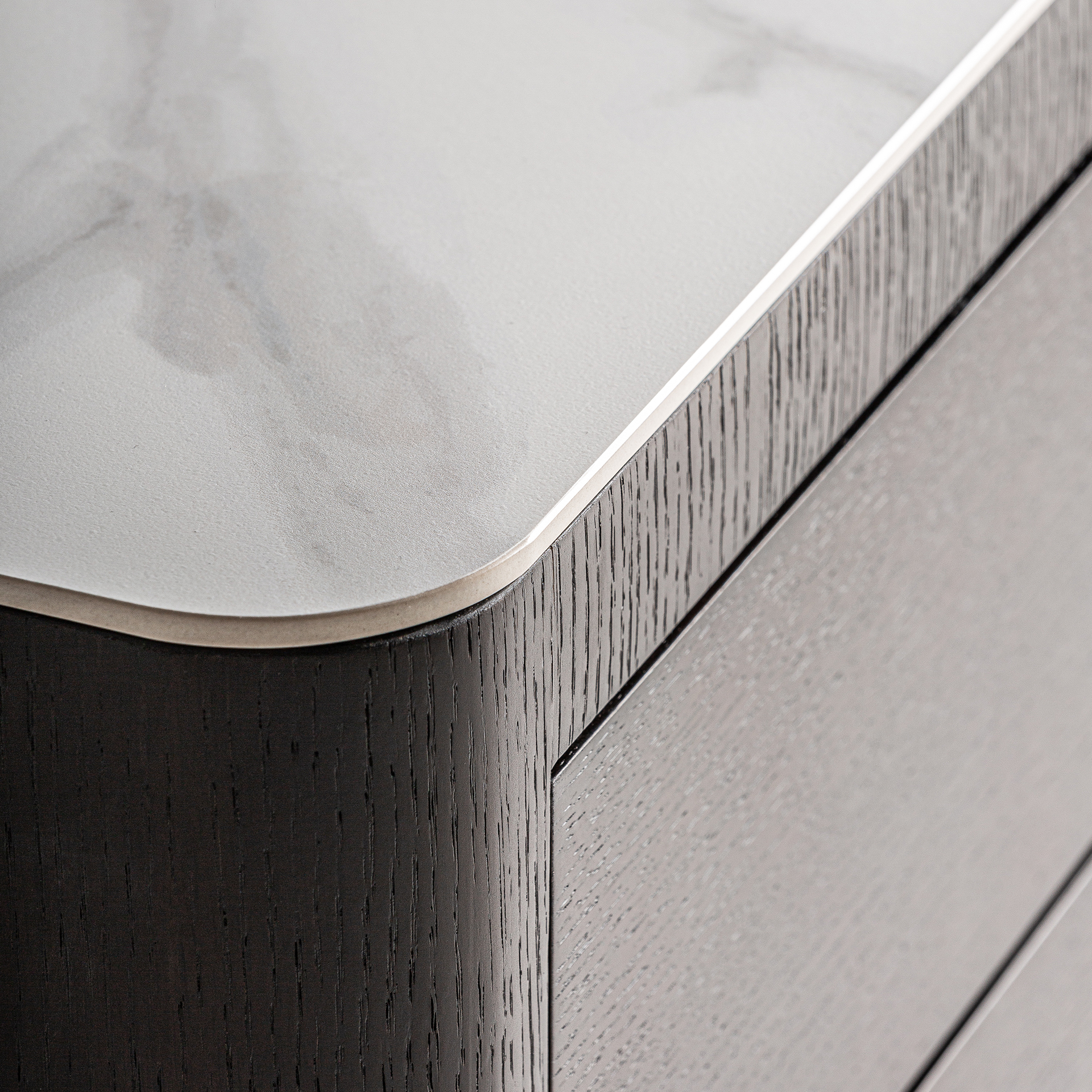 Diseñada para los amantes de lo auténtico la mesita de noche Wholen de VICAL combina madera DM marrón con chapa de roble gris y piedra sinterizada blanca. Una pieza sobria que aporta textura y funcionalidad al dormitorio.