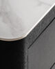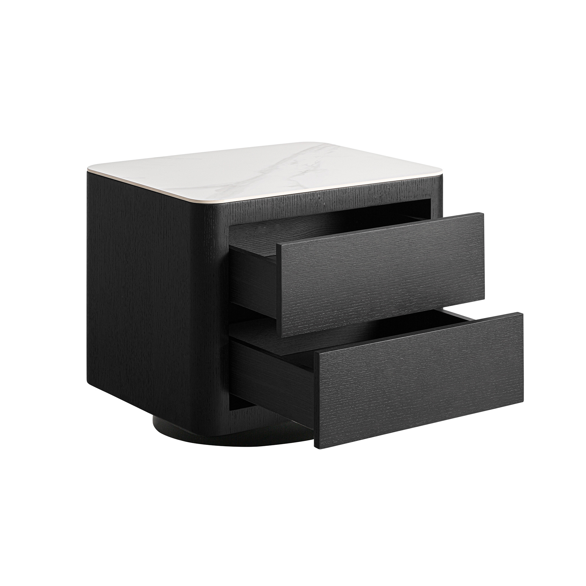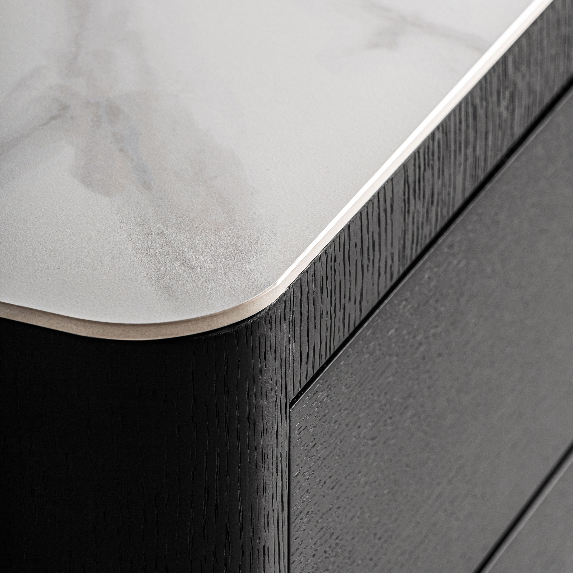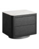 La Mesita de Noche Wholen de VICAL destaca por su inspiración art déco reinterpretada desde una clave actual. Fabricada en DM negro, combinada con chapa de roble gris y sobre de piedra sinterizada blanca, genera un contraste elegante y sofisticado. Su volumen rotundo y su base circular aportan personalidad al espacio, convirtiéndola en una pieza ideal para proyectos que buscan un punto distintivo sin renunciar a la funcionalidad y la armonía visual.
