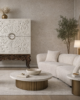 Desde el primer vistazo, el Mueble bar Alexandra cautiva con su exquisito acabado y sus detalles meticulosos. Sus cuatro puertas centrales, adornadas con dibujos geométricos delicados, transforman cada espacio en una galería de arte funcional. Los tiradores, finamente labrados en latón formando un círculo perfecto, reflejan la pasión por los detalles que caracteriza a Lógara Colección. Cada pieza se fabrica bajo un proceso artesanal que combina técnicas tradicionales con innovadoras, garantizando una durabilidad y estética inigualables.