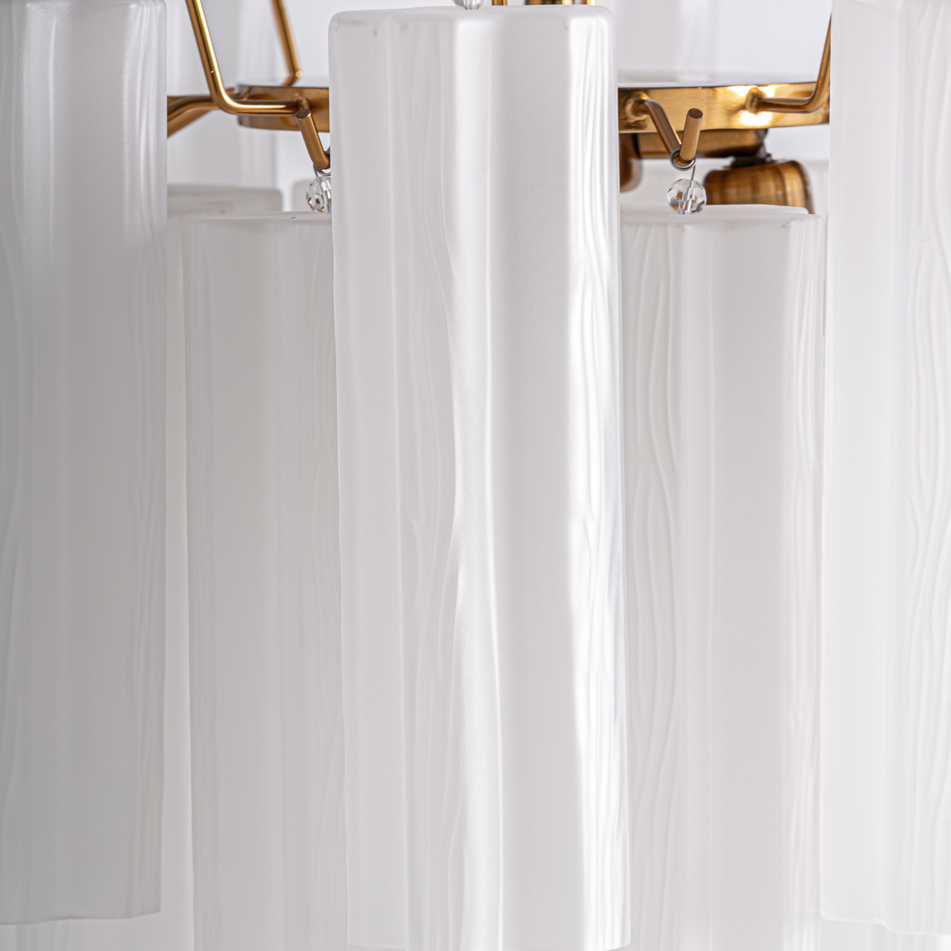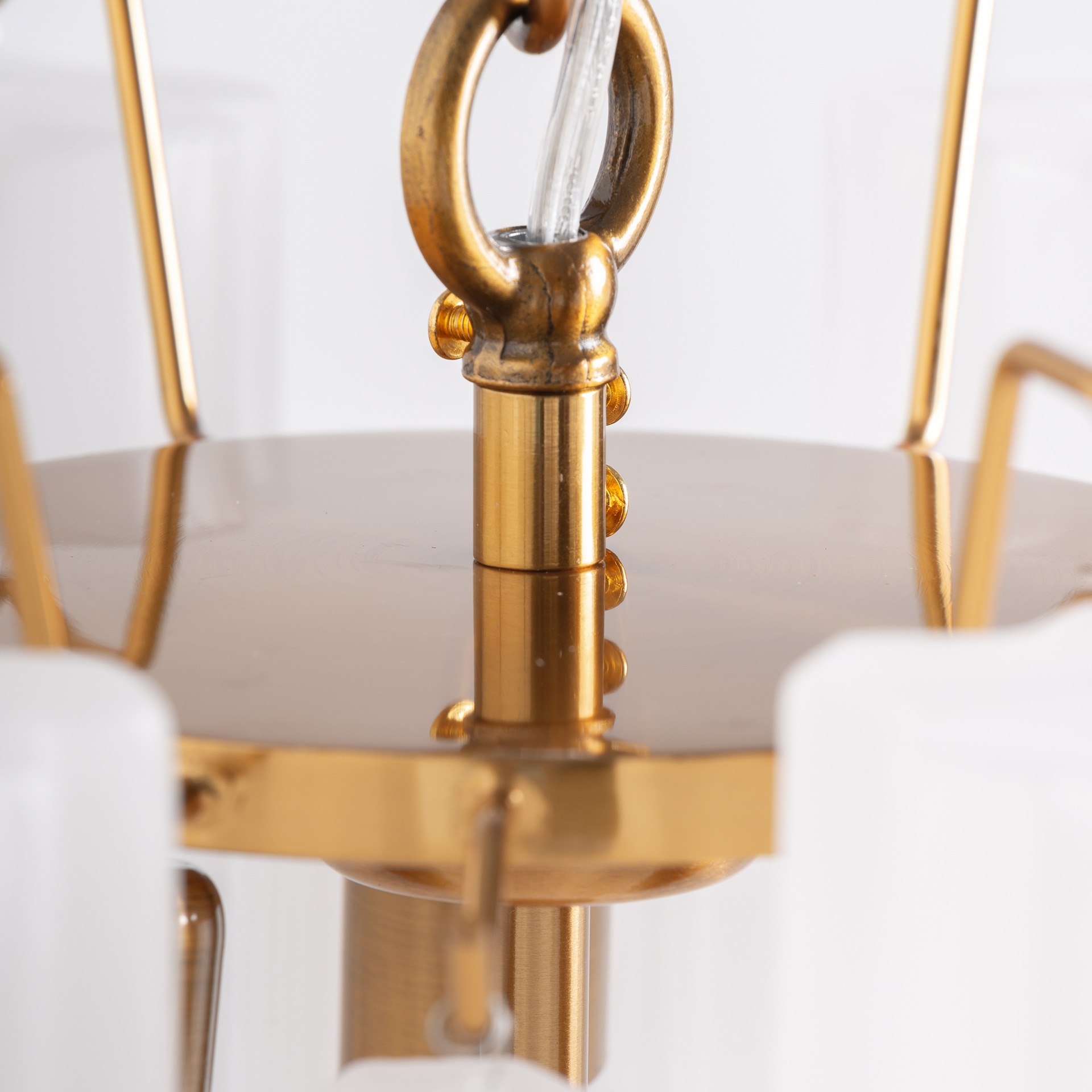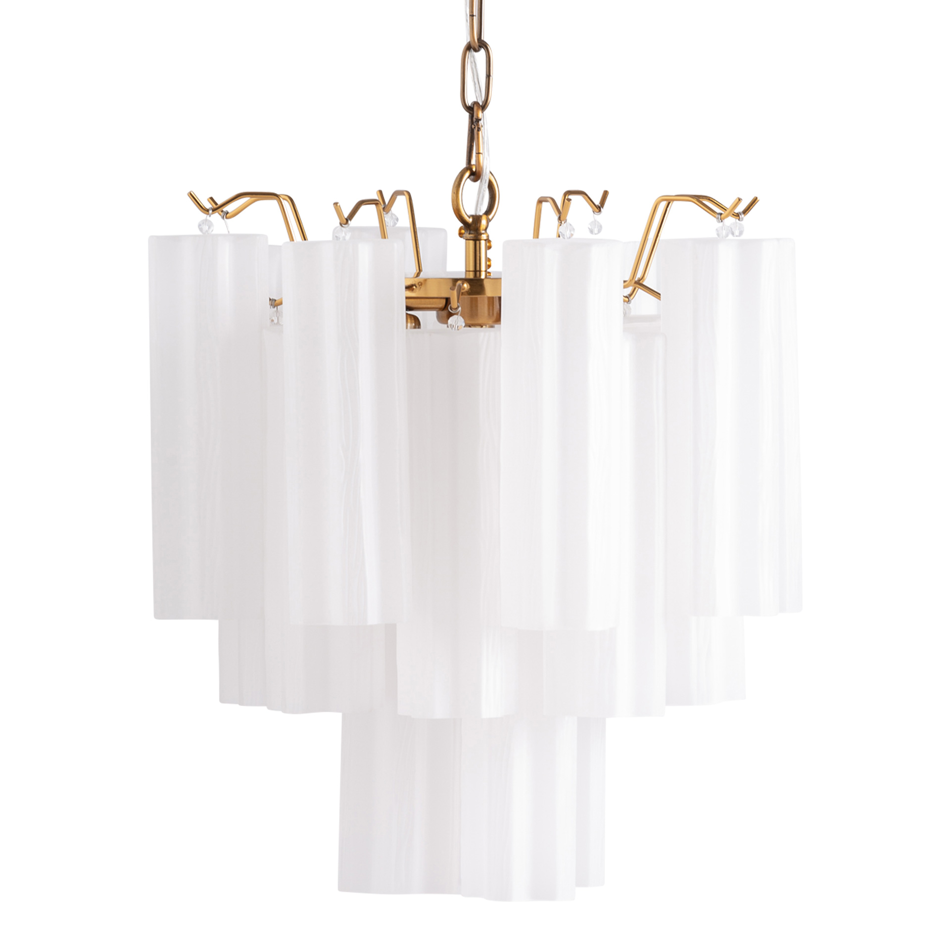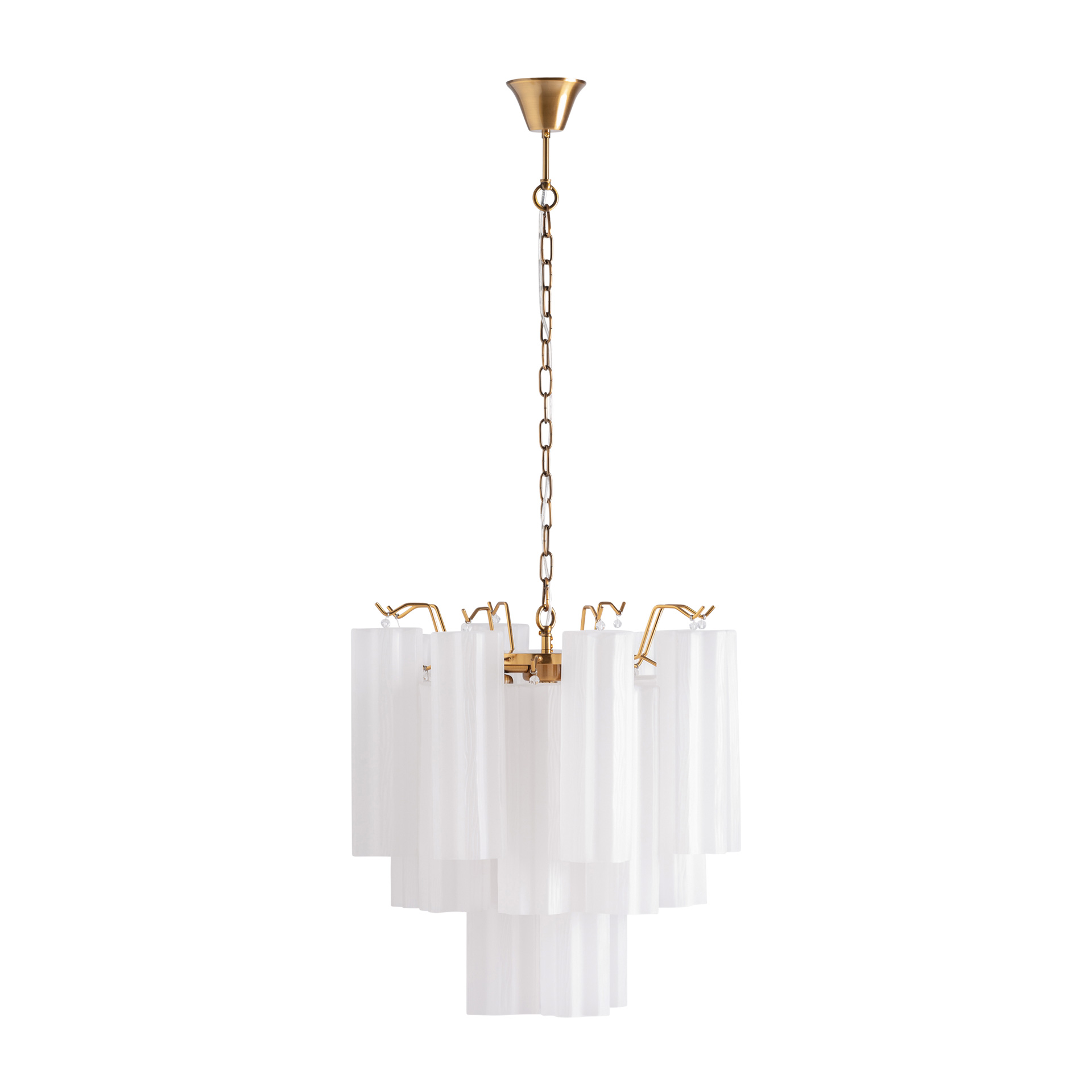 La Lámpara de Colgar Palesha de VICAL destaca por su presencia volumétrica y su conjunto de pantallas en cristal blanco combinadas con acero oro. Una opción elegante para proyectos que requieren una iluminación protagonista con un acabado delicado y muy estético.