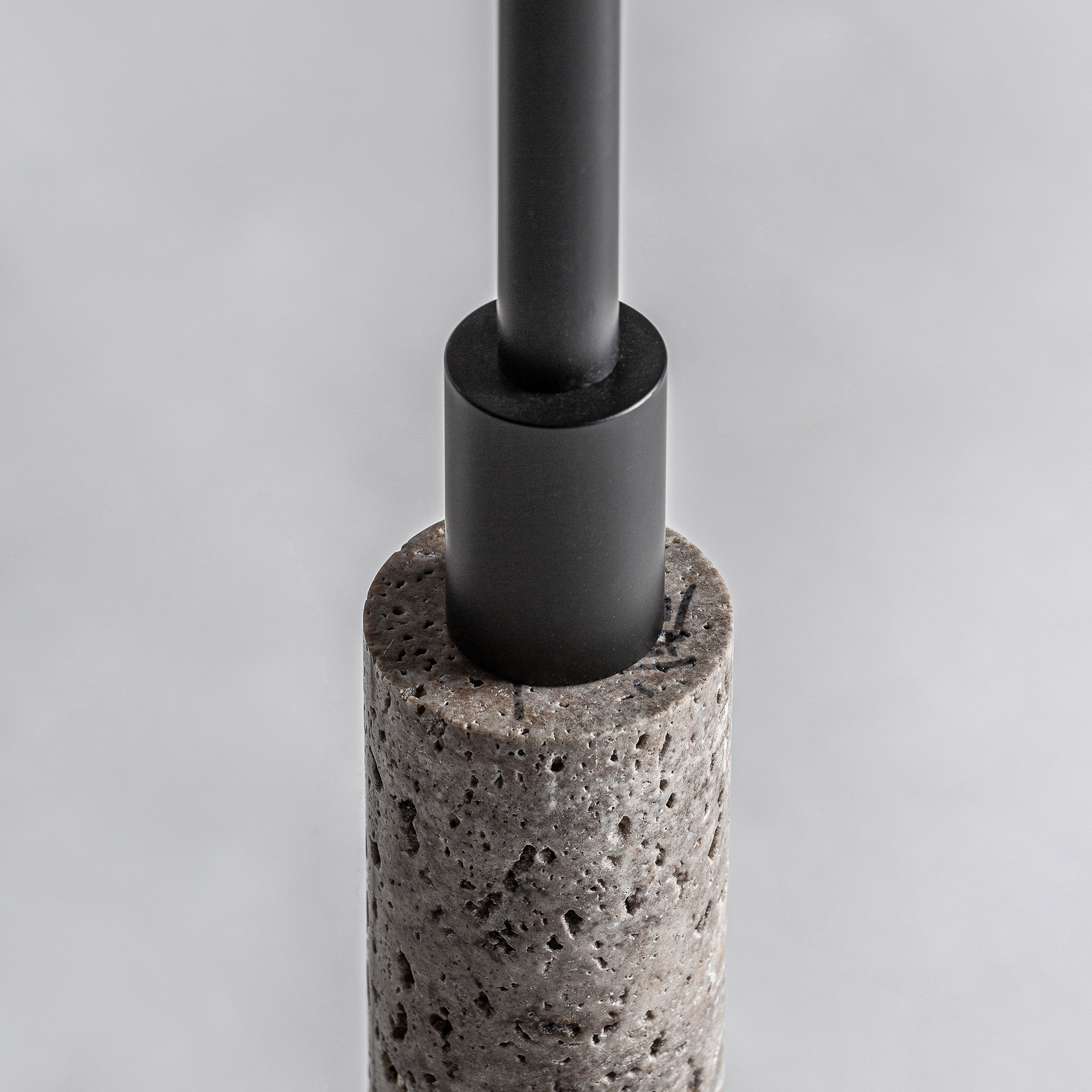La versión de pie de Atlas refuerza su presencia escultórica. La columna de mármol gris unida al hierro negro crea un equilibrio perfecto entre materia y verticalidad. Una pieza con aire arquitectónico para ambientes que quieren una iluminación distintiva.