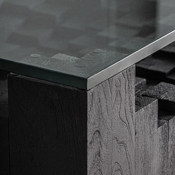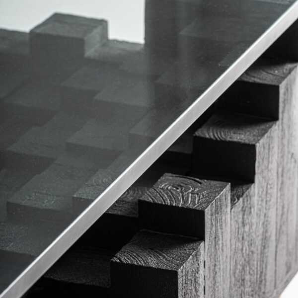 La Mesa de Centro PÈTRIA de VICALDESIGN establece un diálogo poético entre piedra y cristal. Su base geométrica inspirada en las formaciones de basalto sostiene un sobre de vidrio que deja ver la estructura interior como estratos de historia geológica. El contraste entre la solidez mineral y la transparencia luminosa genera equilibrio y elegancia contemporánea.