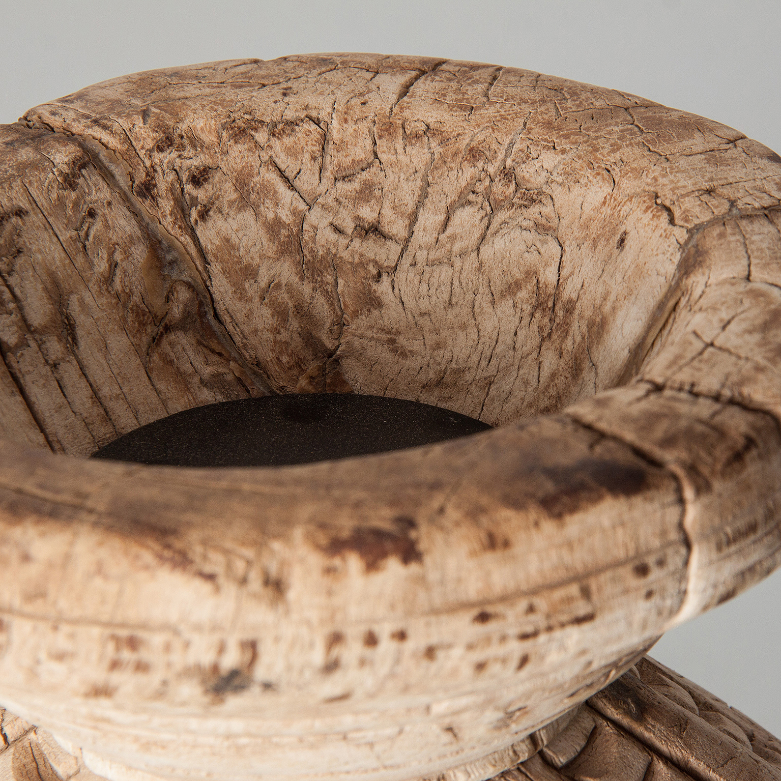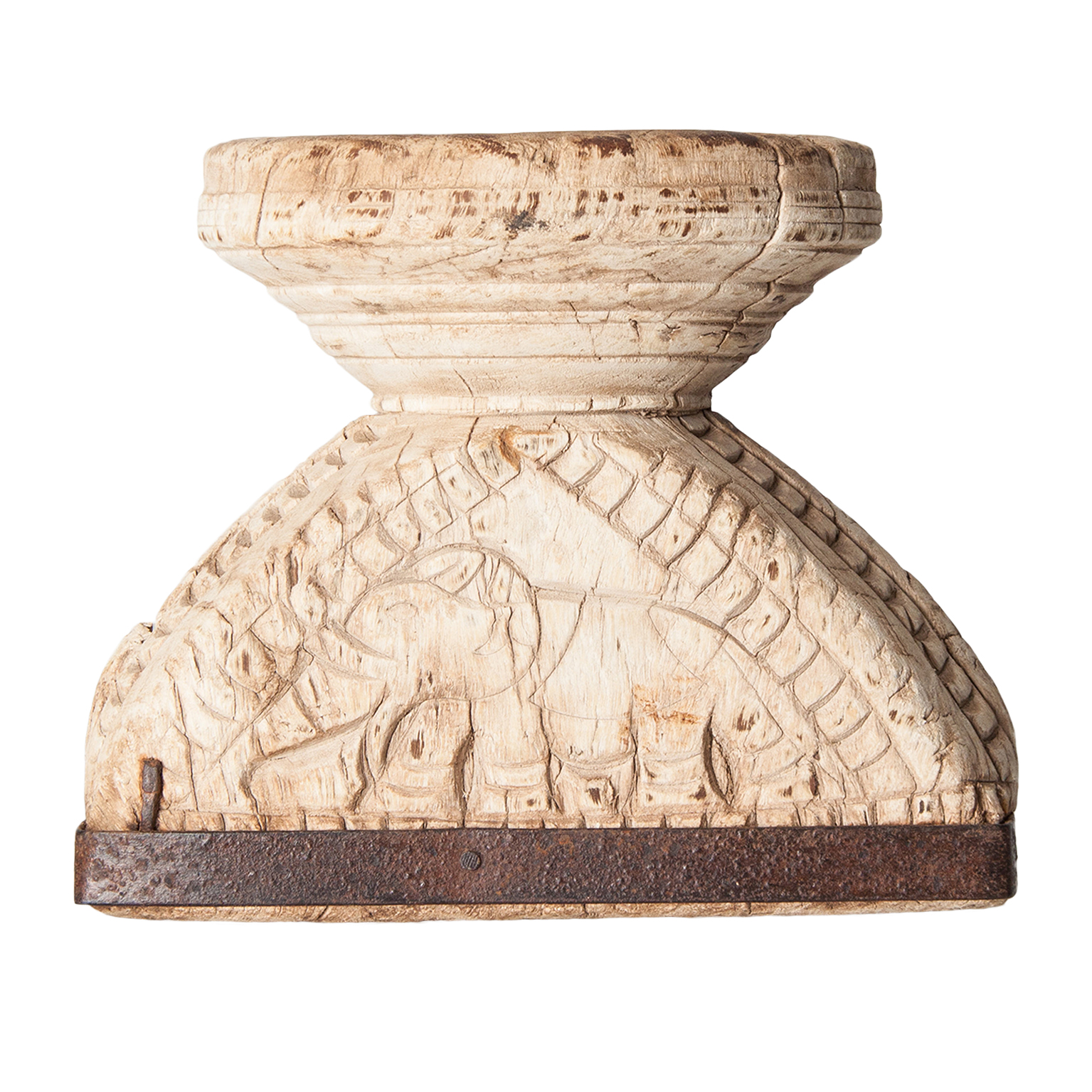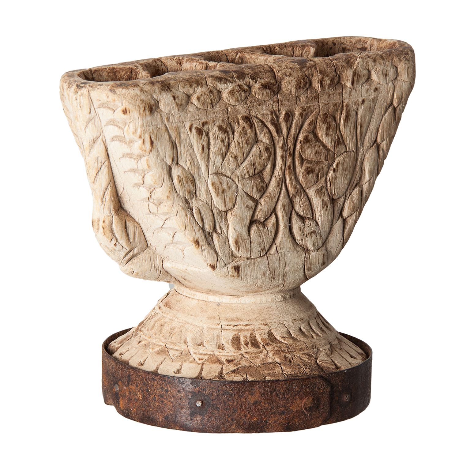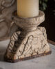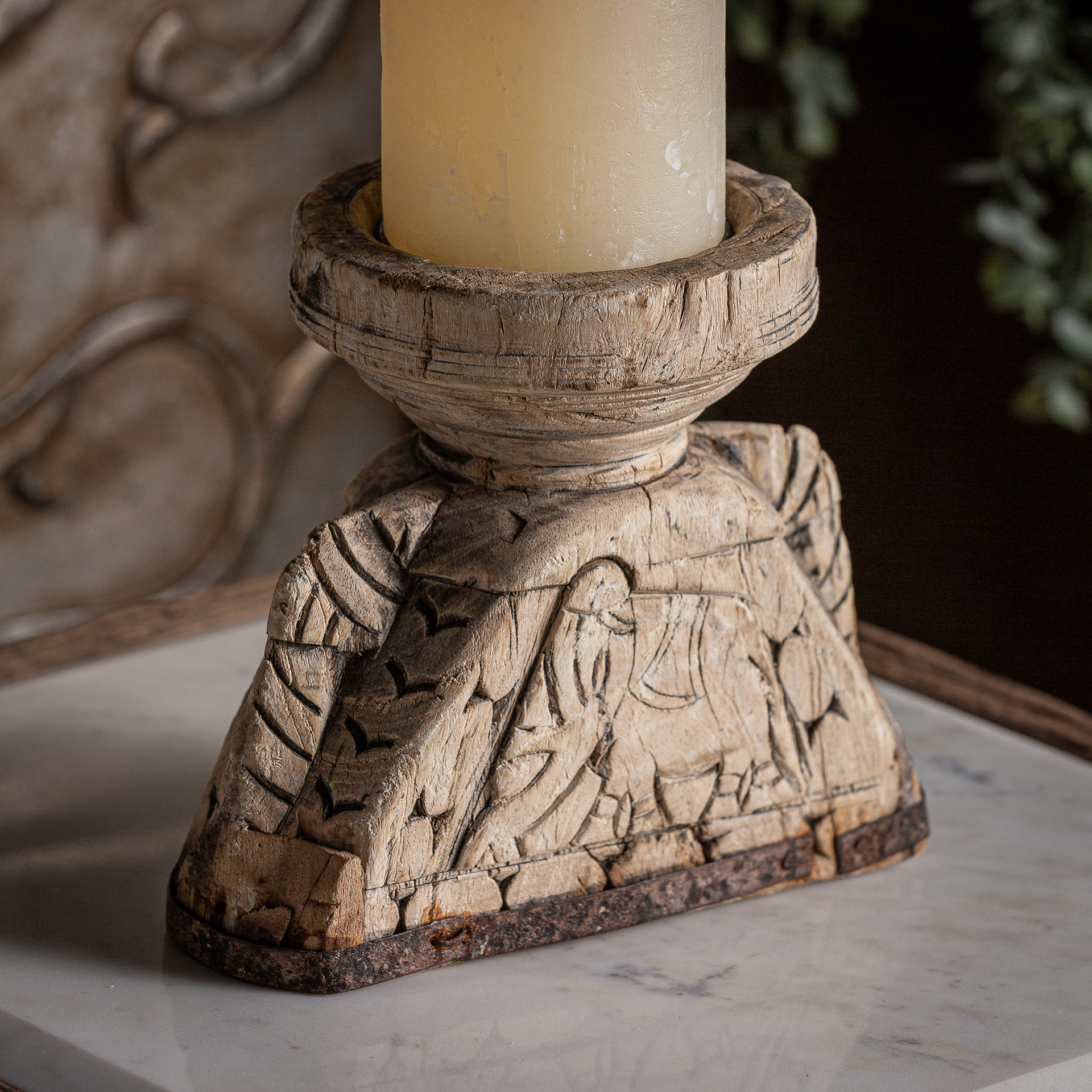 Este portavelas semicircular en madera de teka blanca envejecida con detalles en hierro destaca por su estética étnica y acabado artesanal. Una pieza de VICAL que aporta carácter y luz tenue.